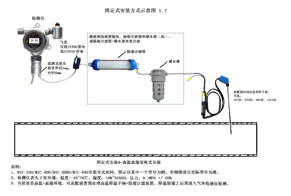 采樣單元采集現場的被測氣體,預處理單元對氣體進行除濕、過濾粉塵,并將被測氣體的濕度恒定在一定范圍,處理后的氣體接入我司MIC-500-CO檢測儀(配流通接頭)進氣口,進行實時監測并顯示在儀器上,并通過信號接口將數據進行傳輸到客戶的監測系統進行數據監控。