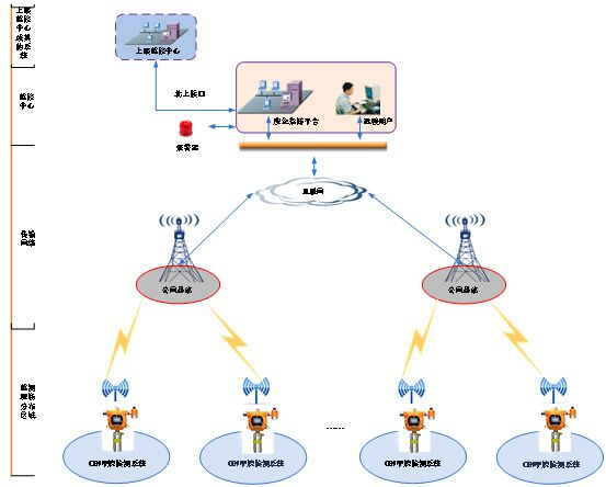 系統由前端監測設備、傳輸網絡、后端應急管理平臺等組成,實現在線實時監測。用戶可使用移動終端,電腦查看監控中心數據。
